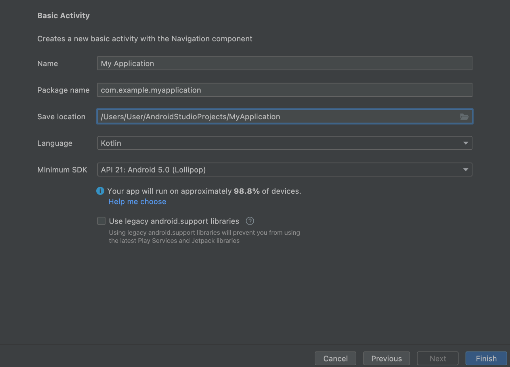- Add an Activity: Select a template for the main activity (e.g., Basic Activity).